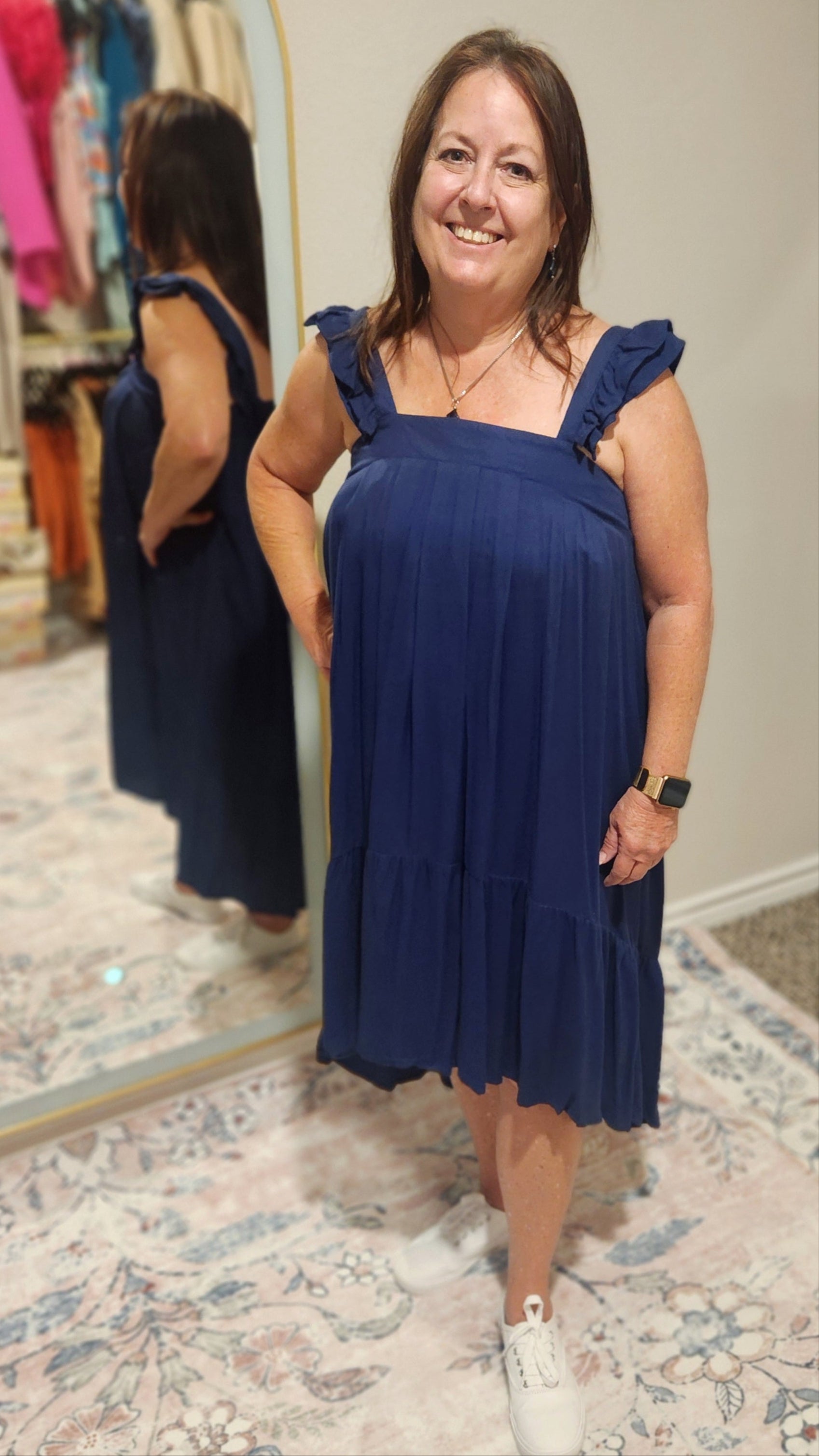 Stay cool and effortlessly stylish in this Navy Hi-Low Midi Dress, your new go-to for warm, sunny days. Designed with a flattering square neckline and double ruffle sleeves, this sleeveless silhouette brings just the right amount of flair to your summer wardrobe.